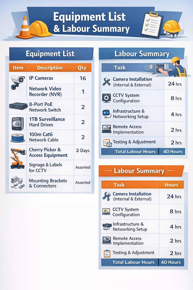 Structured equipment lists and labour summaries, generated from internal data but presented in a customer-friendly format.